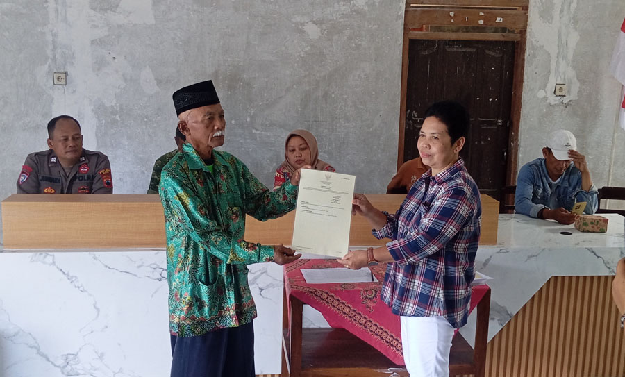 “Di hari ini juga, perlu kami sampaikan bahwa tanah pengganti yang sudah diserahkan kepada pihak Pemdes otomatis menjadi atau sudah dikuasai pihak desa. Dimana ke depannya semoga bisa bermanfaat secara maksimal,” lanjut Nuryanto sebelum sesi penyerahan sertifikat dilakukan.